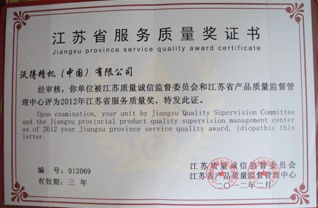 江蘇省服務質量獎證書